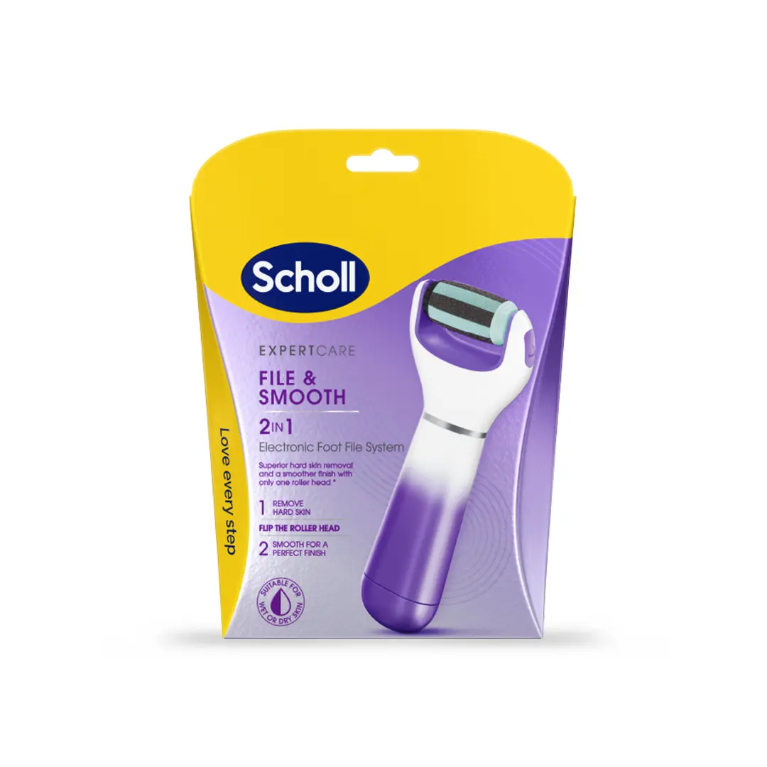 Scholl File and Smooth 2-in-1 er det nyeste tilskuddet i Scholls fotfil-sortiment og tilbyr noe ingen andre i testen gjør: filing og polering i én og samme enhet. Den patenterte 2-i-1-rullen har en grov side for fjerning av hard hud og en fin side for polering, slik at du kan fullføre hele pedikyrbehandlingen med ett verktøy.